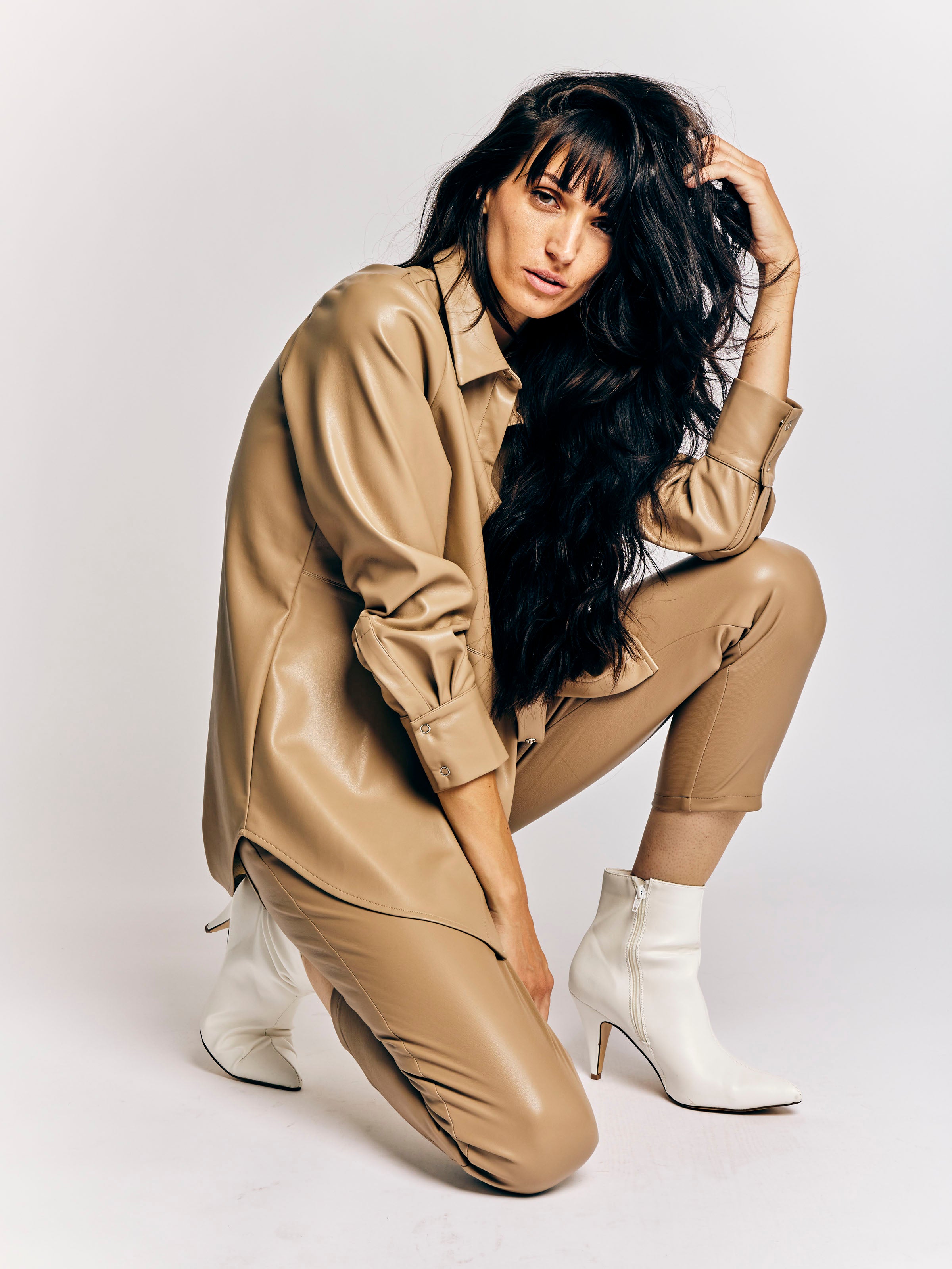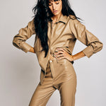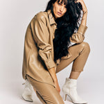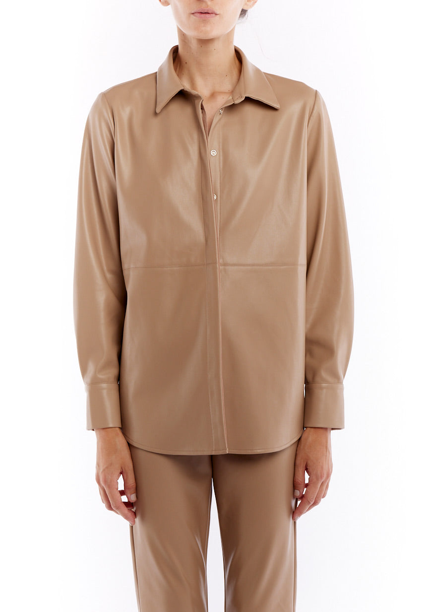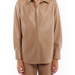 faux leather button up with long cuffed sleeves and relaxed fit in taupe
