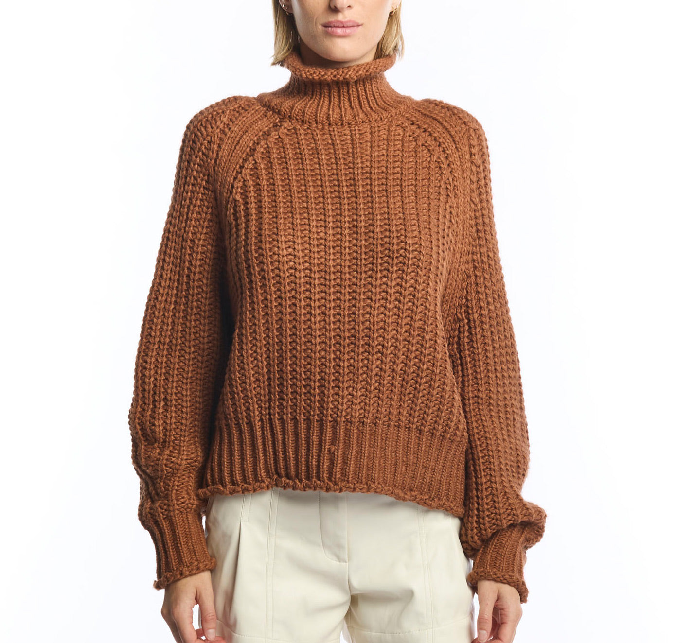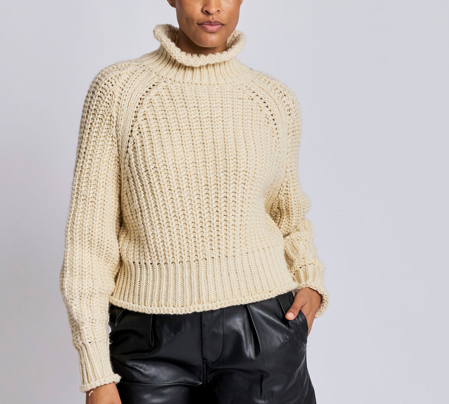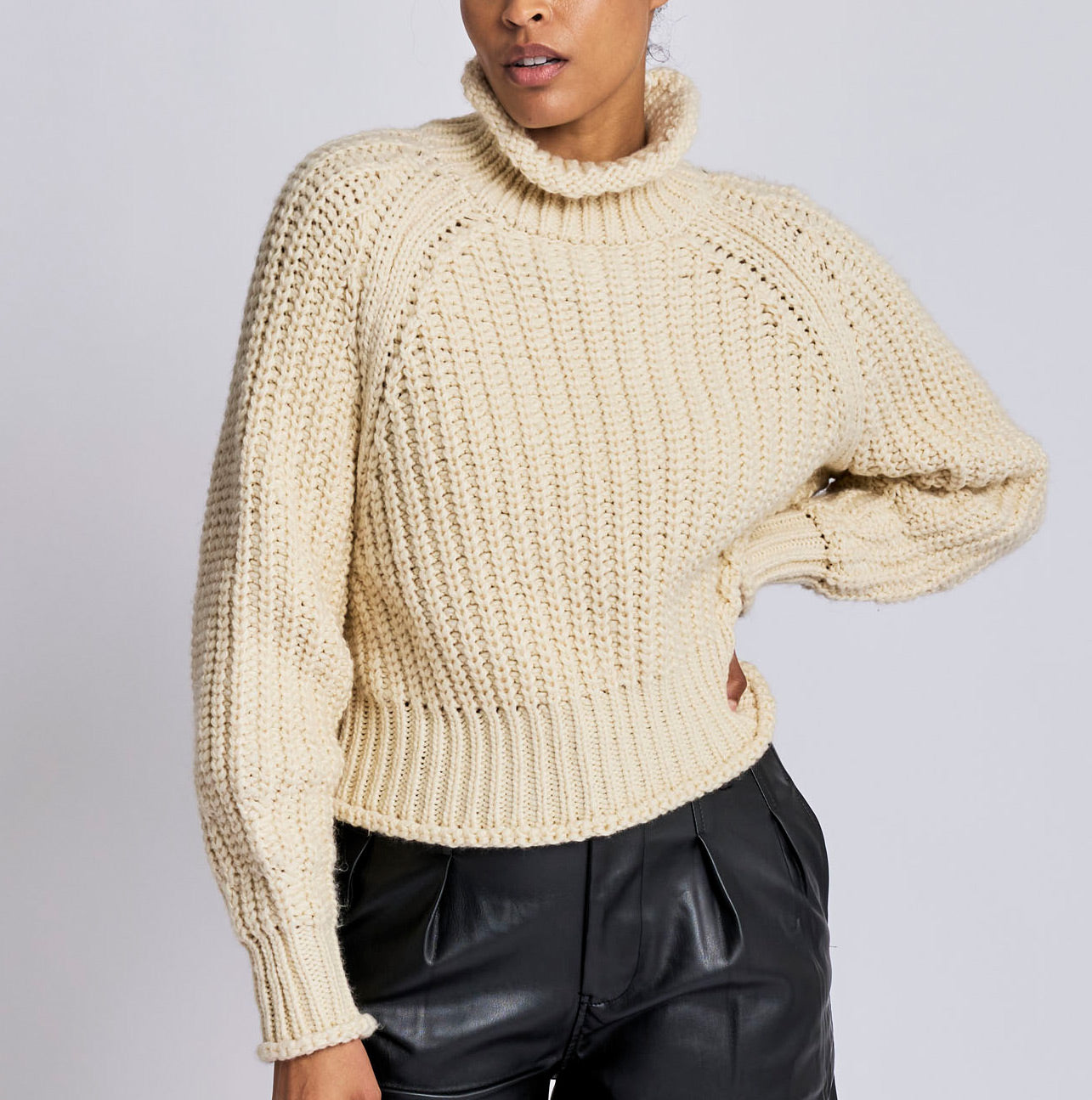ribbed, chunky knit turtleneck sweater featuring slight balloon sleeves and a funnel neck in grey