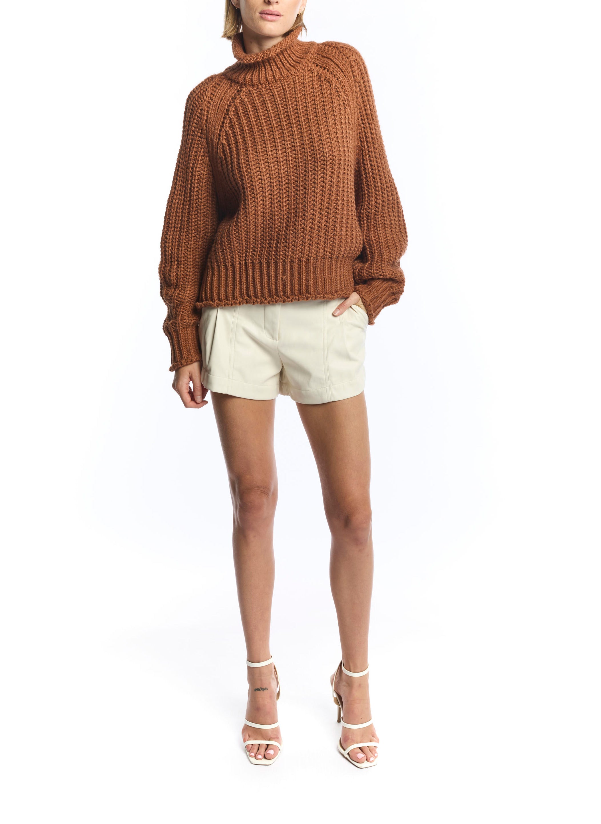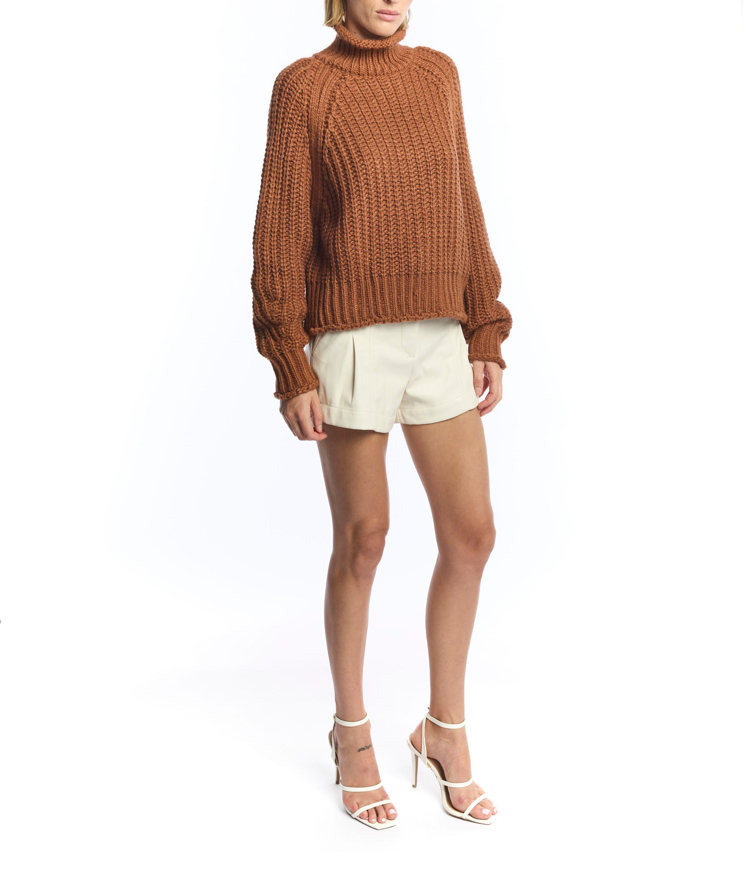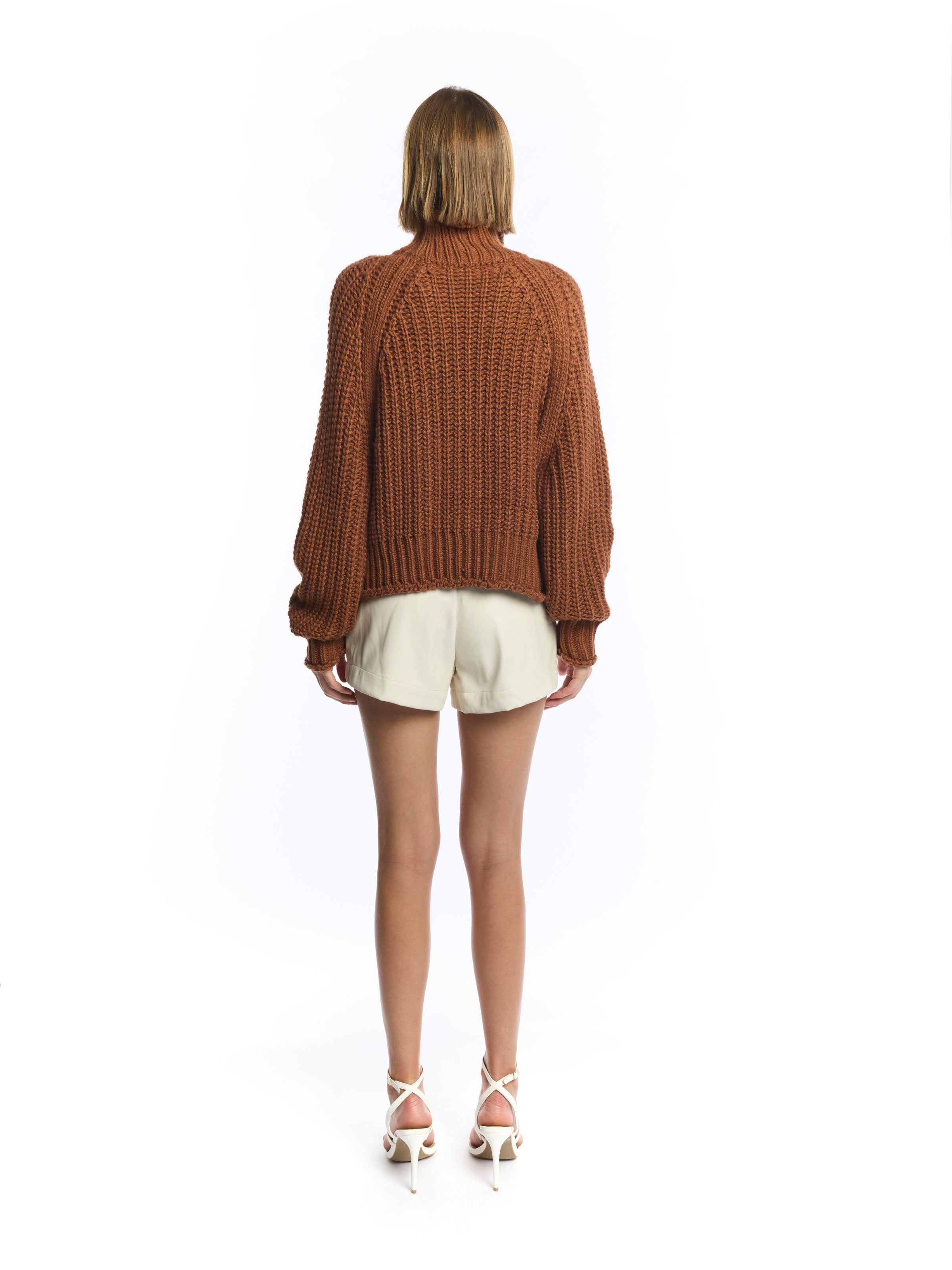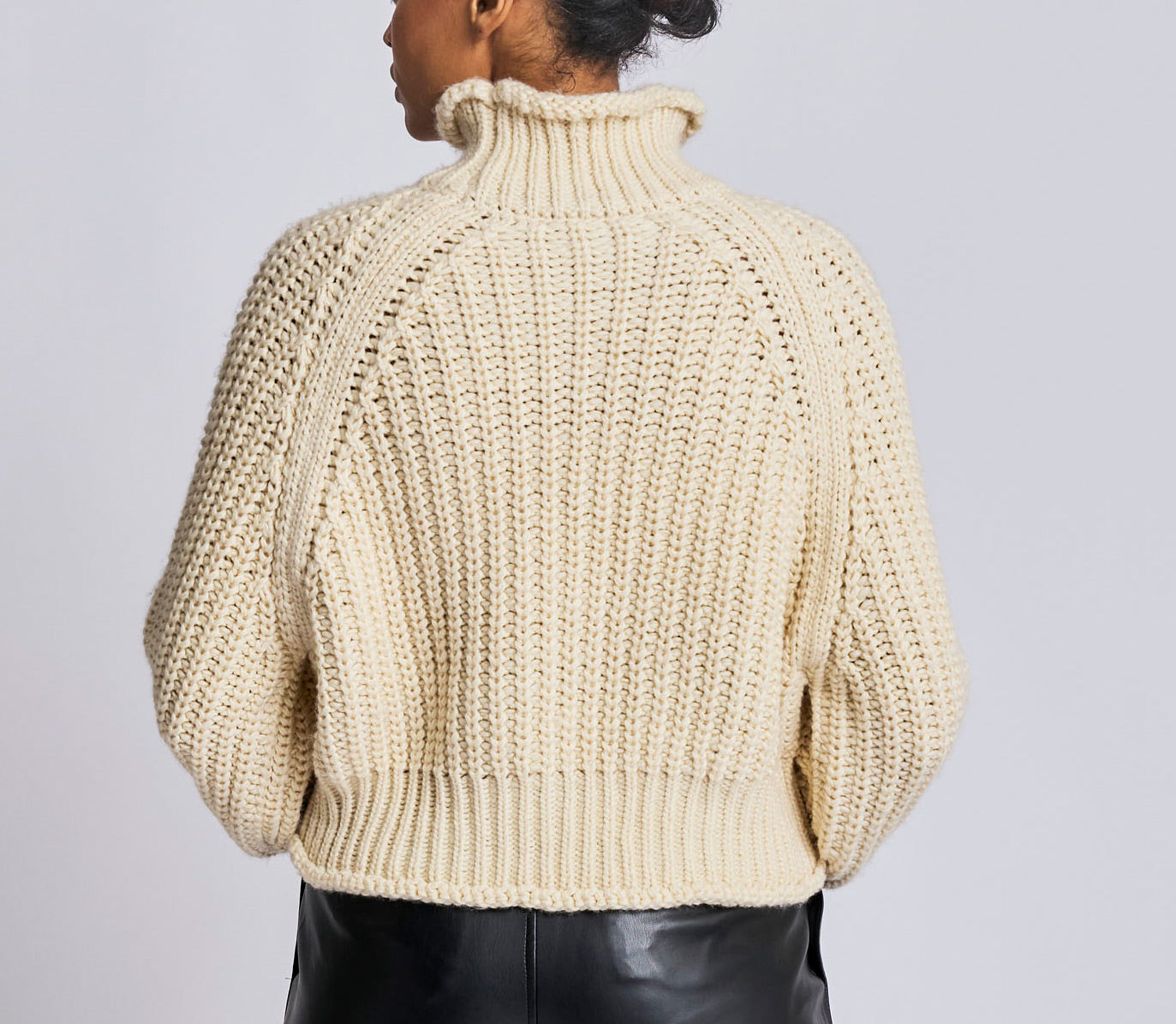 ribbed, chunky knit turtleneck sweater featuring slight balloon sleeves and a funnel neck in grey