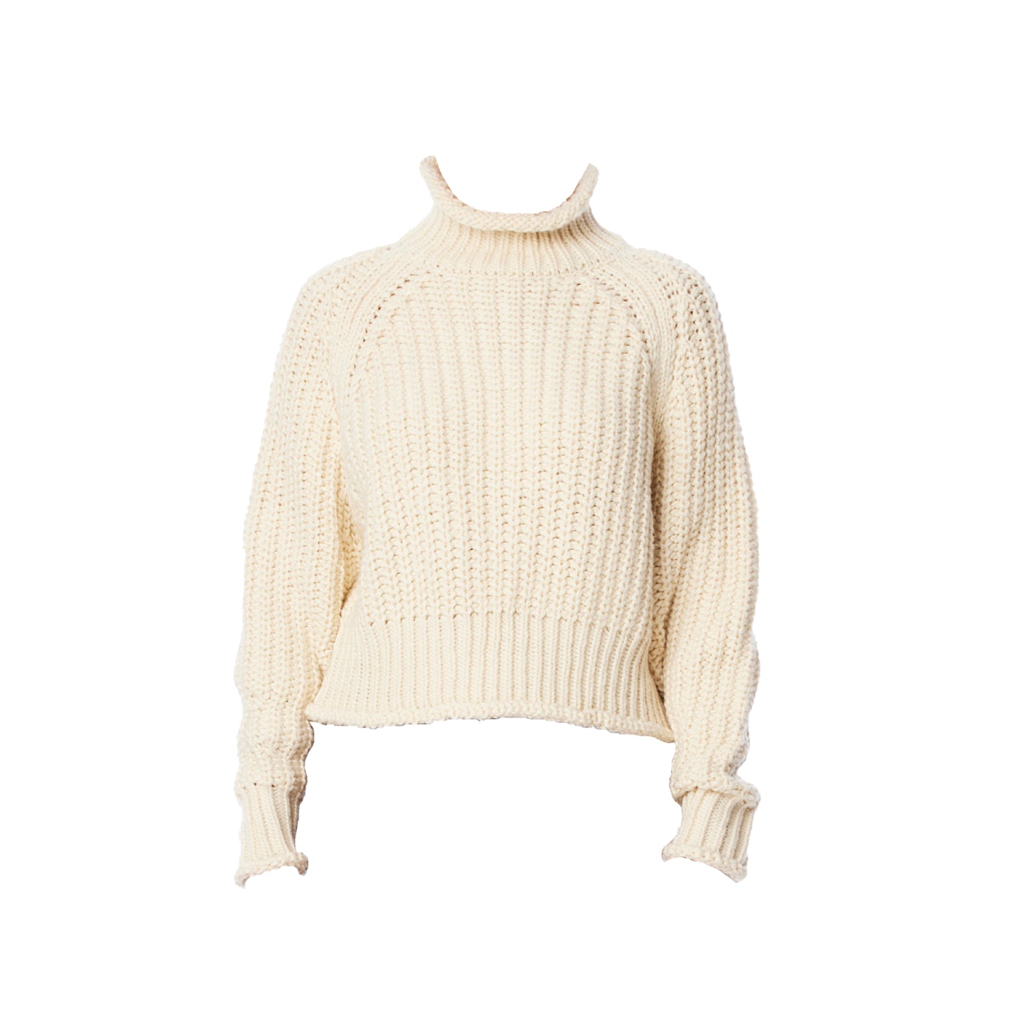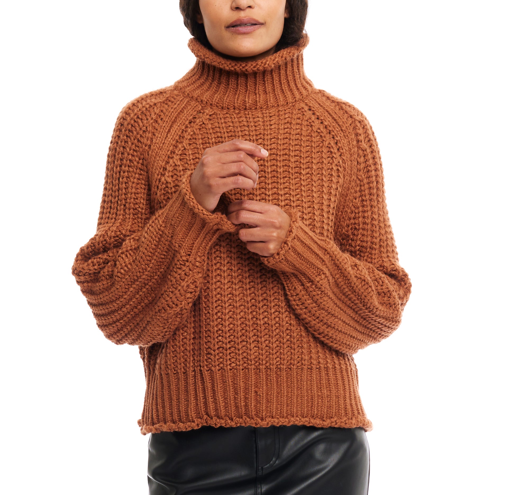 ribbed, chunky knit turtleneck sweater featuring slight balloon sleeves and a funnel neck in black